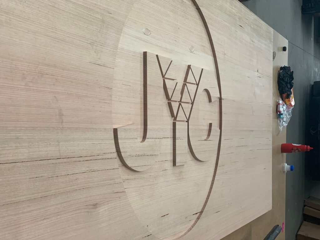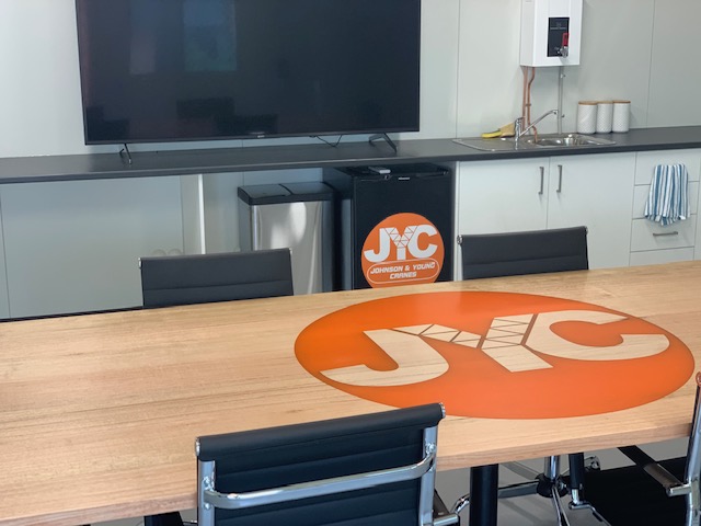 Large 6-8 seater conference table with rebated resin logo for melbourne based crane company ‘JYC’.